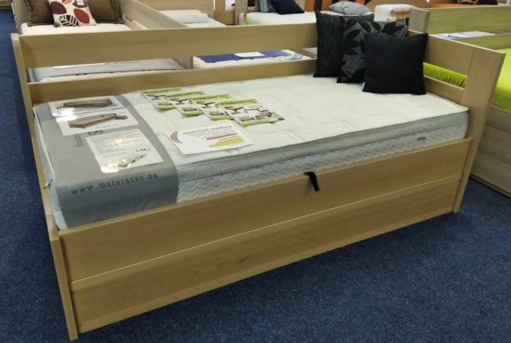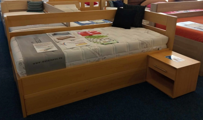 Rohové masivní lůžko v buku přírodním, s celoplošným úlož.prostorem a masivním roštem na pístech. Rozměry: 100x206/v.90/v.bočnice od země 45cm, ložná plocha: 90x200cm. Cena bez matrace- doporučíme. IHNED K ODBĚRU!!!
