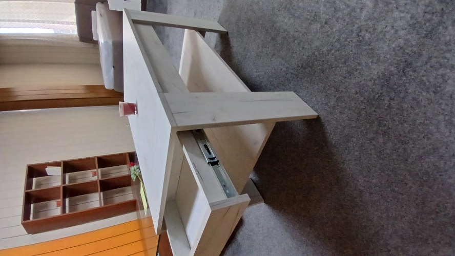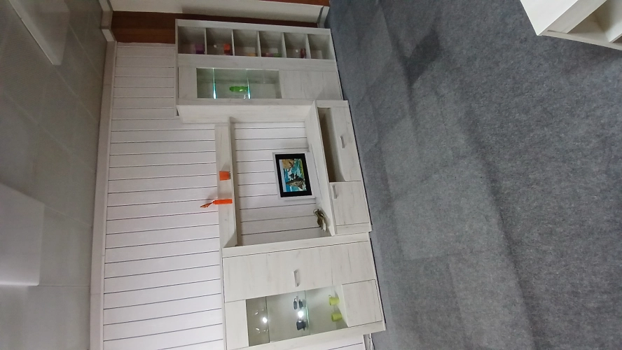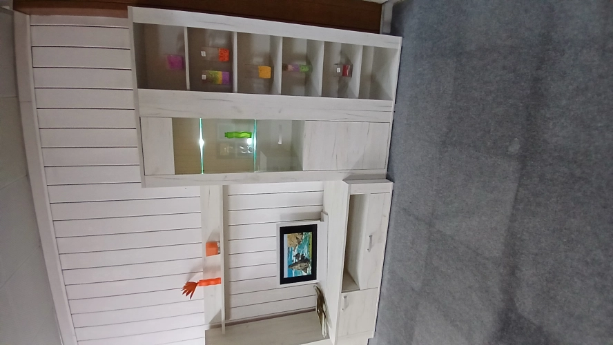 Obývací sestava Adel: č.1,2,3,4,5 . Rozměry: celk.šíře 378cm, hl.42,5cm/tv hl.52cm, výška 45/162/200cm, polička š.150/v.24cm, kon.stolek se zásuvkou v odstínu Dub bělený, Led osvětlení a příplatkové úchytky. Ihned k odběru! DOPRODEJ !!!